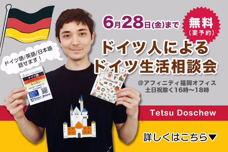 アフィニティ福岡オフィスでは、ドイツ人Tetsu Doschewによる留学&海外生活無料相談会を開催しています。