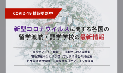 お役立ち情報新型コロナウイルス(COVID-19)感染拡大に伴い、現在様々な国で入国時の検疫の強化(健康申告書等の提出)や入国、ビザ発給の制限が行われています。留学をご予定のお客様におかれましては、大変ご不安な思いをなさっている方も…