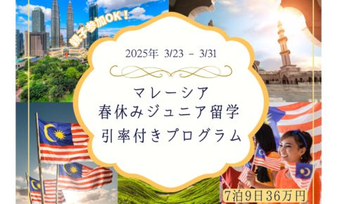 おすすめジュニアプログラム〈 本プログラムは催行済みです 〉 今年の春休みは留学を経験したい 英語を使ってグローバルな環境に触れてみたい できるだけ費用を抑えられる留学先から選びたい 春休みの留学先を検討している方におすすめの、引率付きのマレーシ…