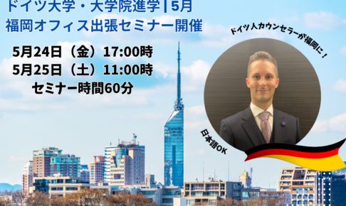 海外の大学や大学院のおすすめプログラム2024年5月24日(金)、25日(土)の2日間、ドイツ留学カウンセラーの福岡出張に合わせてドイツの大学や大学院への進学を希望する方向けのセミナーを開催したいと思います。 セミナー後には通常zoomやスカイプなどの遠隔ビ…