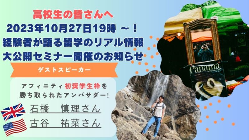 今回は、これからご留学を予定されている方向けに、今年アフィニティ独自の奨学金制度を利用し、ご留学された高校生アンバサダー2名の方に「経験者が語る留学のリアル情報大公開!という事でご自身の実体験、そして留学を通してお感じになったことなどお話頂く体験談セミナーを開催いたします。