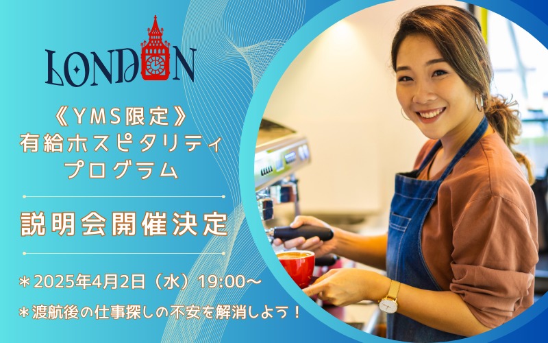 今回の説明会でご紹介する有給ホスピタリティ就労プログラムでは、ロンドンにある語学学校に最低4週間以上通うことで、学校専属の就職支援のプロが、イギリスでの英語環境の仕事探しをサポートしてくれる、特別プログラムについて詳しくご紹介します。