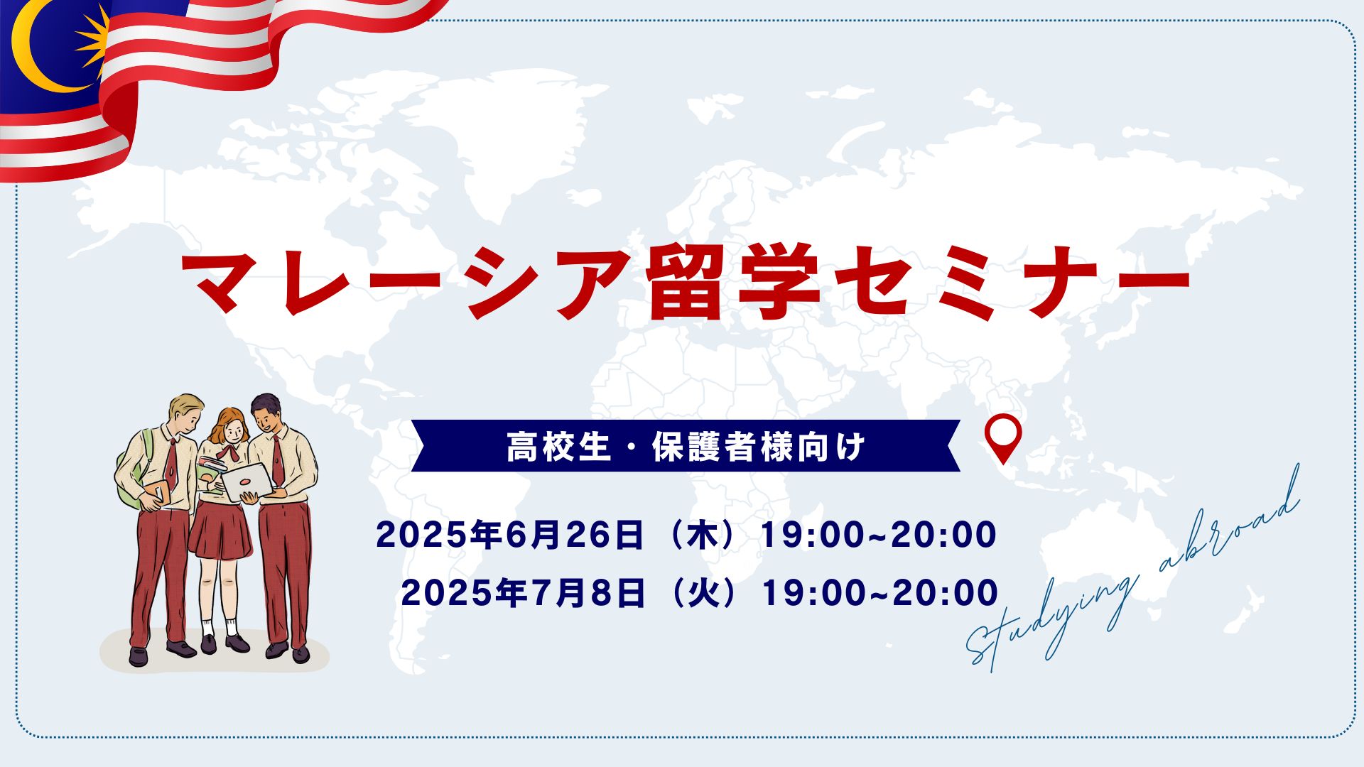 費用を抑えながら、英語力も国際感覚も身につけたい方にとって、マレーシアはおすすめの選択肢です。将来の選択肢を広げたい中高生や、留学に興味のある保護者の皆さまにとって、有意義な時間になると思いますどうぞお気軽にご参加ください。お待ちしております!