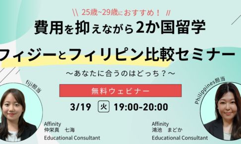 オンラインセミナーアフィニティでは新型コロナウィルス拡大防止のため、通常各オフィスにて行なっているセミナーをオンラインで開催しております。 在宅での視聴が可能ですし、顔出しもご希望でない場合は不要ですので、気軽にご参加・ご視聴いただけます。 この機会にアフィニティのオンラインセミナーをぜひご利用ください。 オンラインセミナー一覧住んでいる日本人に本音で聞く、アイルランド留学・ワーホリのリアル ― ダブリン&コーク、実際どう? ―2025年12月22日2026年度(第11期)【トビタテ!留学JAPAN オンライン説明会】 高校生 ~返済不要の留学奨学金~2025年11月5日【7/8(火) 19:00-】まだ間に合う!夏のマレーシアジュニア留学セミナー開催!2025年6月12日[まだ間に合う!2025年秋出発!]イギリス休学留学セミナー|休学留学の種類|費用|語学|学部聴講|認定留学|YMS|オンラインZoom開催2025年5月27日【参加無料】2025年7月・8月開催マレーシアジュニア留学オンライン相談会 開催のお知らせ2025年4月25日【3/19(水)19:00-】フィジーvsフィリピン留学比較セミナー開催のお知らせ!2025年3月11日《YMSの方に朗報》知らないと損!お仕事確約プログラム説明会のご案内(先着95名)2024年11月1日2025年度(第10期)【トビタテ!留学JAPAN オンライン説明会】 高校生 ~返済不要の留学奨学金~2024年10月30日(終了しました)YMS体験談セミナー開催(先着95名)家探しと仕事探しの不安を解消、就職支援も活用を!2024年10月18日5月30日(木)18時30分~ 【英国サセックス大学現役大学生が語る留学の知恵袋】2024年5月18日第2回 グローバルキャリアセミナー『世界の変化とグローバル人材の必要性』2024年3月5日第1回 グローバルキャリアセミナー『キャリアは掛け算という発想 ~言語x専門性①x専門性②で1万人に一人の人材に』2024年2月17日2024年度(第9期)新高校1年生 【トビタテ!留学JAPAN オンライン説明会 】 4月応募 ~返済不要の留学奨学金~2024年2月5日2023年11月18日(土)11:00~12:00 【グローバルキャリアセミナー】 ~参加費無料~2023年11月14日《英語圏・ドイツ》大学・大学院への正規留学30分セミナー【進学はアフィニティ】*12月分募集終了2023年11月10日[2024年]初海外!ワーホリどこ行く?世界ワーキングホリデーフェア開催|ビザ|仕事情報|費用|学校|準備の完全ガイド2023年10月6日8月31日(木)19時00分~ 【英国サセックス大学現役大学生が語る留学の知恵袋】2023年8月28日【終了】長期がお得!ニュージーランド語学留学セミナー2023年6月20日8月27日(土)14時~【オンライン海外留学セミナー・知っておきたいグローバル併願】2022年8月4日7月12日(火)18時30分~ 【英国サセックス大学現役大学生が語る留学の知恵袋】2022年7月5日