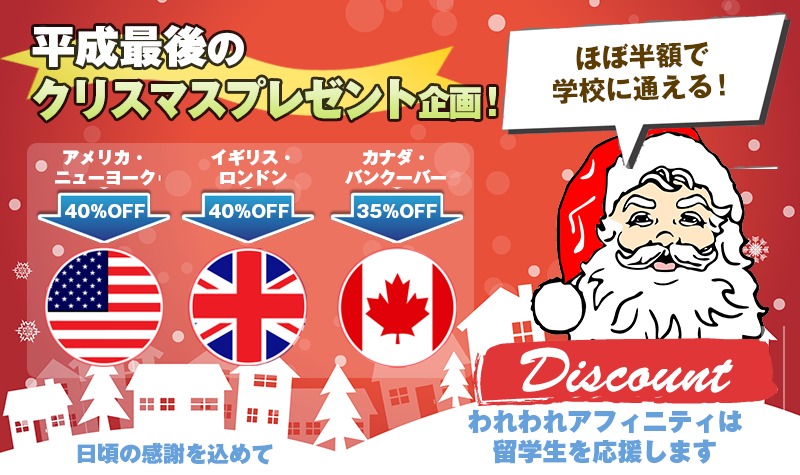 語学学校のクリスマス企画は私も始めての経験です。ですが、本当に激安です。ほぼ半額近い料金で学校に通えます。