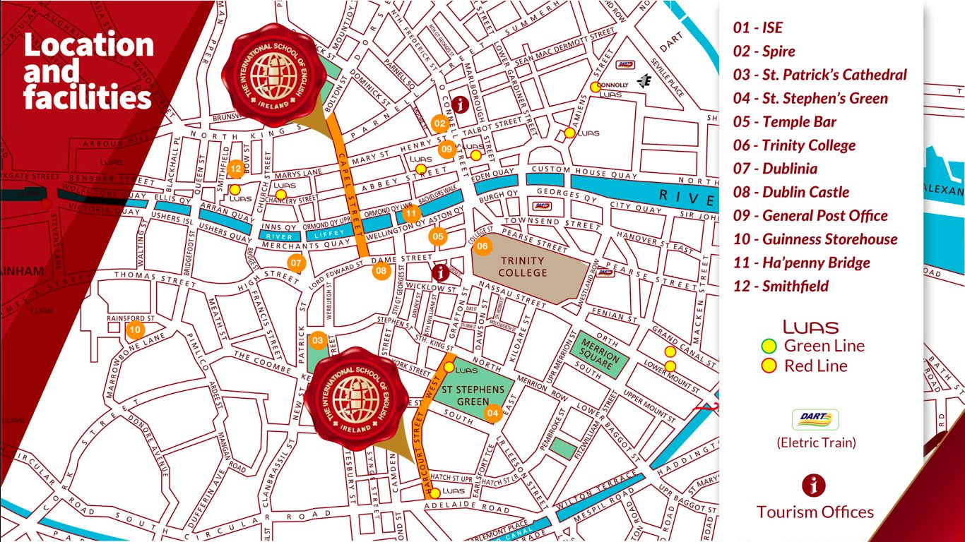 The International School of English(ISE)は、ダブリンに2校あり、市内中心部を流れるリフィー川を挟んで北側と南側、それぞれに校舎を持つ1997年創立の語学学校です。