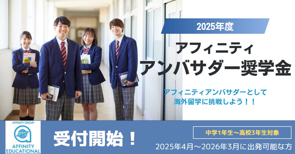 アフィニティでは、2023年度より中学生・高校生を対象に留学支援として、留学費用の一部を奨学金として支給しています。 微力ではありますが、一人でも多くの中学生・高校生の皆さんに留学にチャレンジしてほしいという想いを込めて、2025年も実施いたします! 出来るだけ多くの皆さんに活用していただけると、大変嬉しく思います。