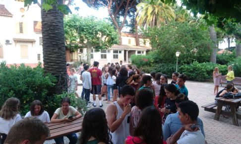 中庭に設置された屋外教室での授業も