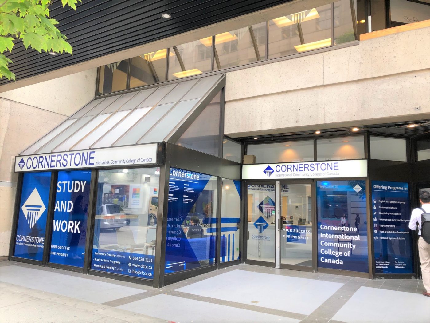 Cornerstoneはバンクーバーのダウンタウンに位置し、電車の駅(約徒歩1分)、レストラン、各種ショップが周りに立ち並びます。キャンパスはManagement キャンパス(ヘイスティングス×グランビル)とTechキャンパス(ロブソン×グランビル)の2つがあり、徒歩で約5分のところにあります。