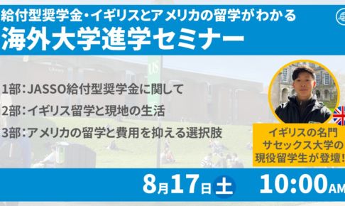 イベント・セミナー情報海外大学進学に興味を持っていらっしゃる高校生、保護者、学校の先生方に向け留学セミナーを開催します。 海外大学に進学するにあたって、生活面、語学面、費用面など、様々なご不安あるかと思います。そんな悩みを解決しつつ、どのよう…